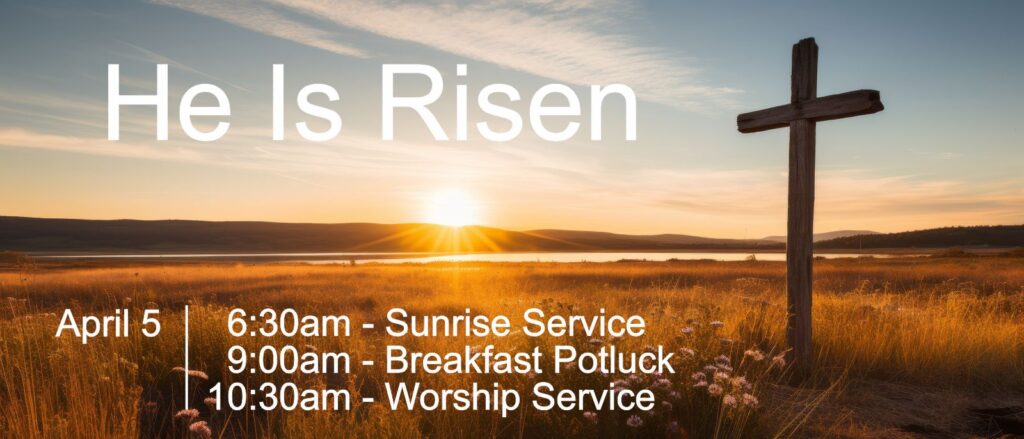 Sunrise Service at 6:30 AM (Camelback Mountain), Breakfast Potluck at 9:00 AM, and Worship Service at 10:30 AM.